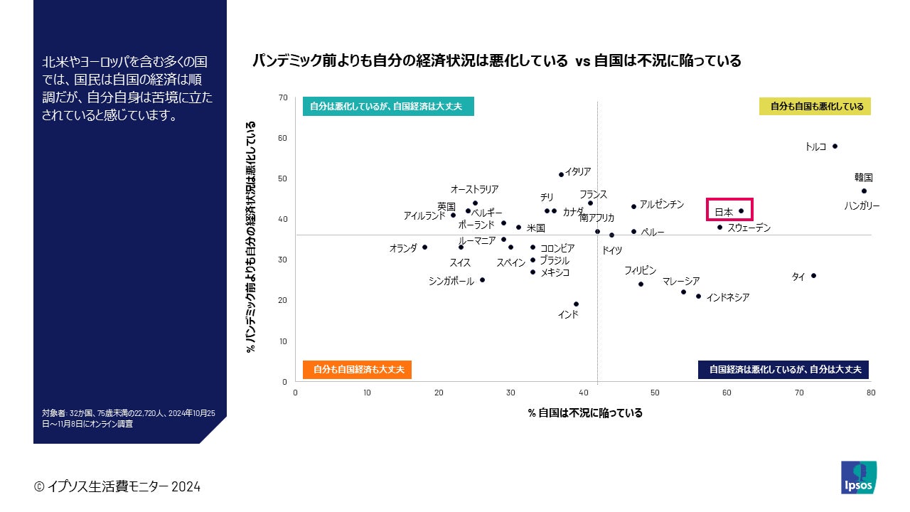 世界最大規模の世論調査会社イプソス株式会社(日本オフィス所在地:東京都港区、代表取締役:内田俊一)は、世界の人々が経済状況についてどのように感じているかを追跡する32か国調査であるイプソス生活費モニター2024年11月を発表しました。