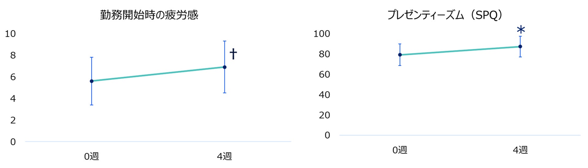 本調査ではプログラム開始後4週間で睡眠の質、物事をやり遂げる意欲、勤務開始時の疲労感の無さ、プレゼンティーズムを示すスコアの向上がそれぞれ確認できました。