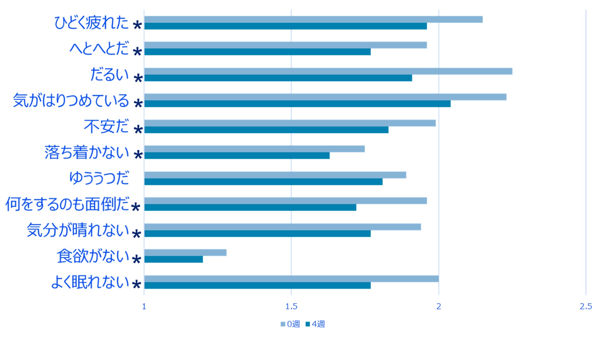 本調査では、プログラム開始後4週間で、心身のストレス反応を示すスコアの多くが有意に減少しました。
