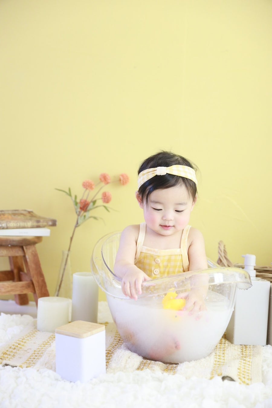 小さなお風呂に赤ちゃんを入れ、ミルクのような色合いのお湯に触れたり、浸かったりする姿を撮影。泣いたり笑ったりと、その瞬間を逃さず記録します。やわらかくふわふわな赤ちゃんらしい魅力を引き出します。