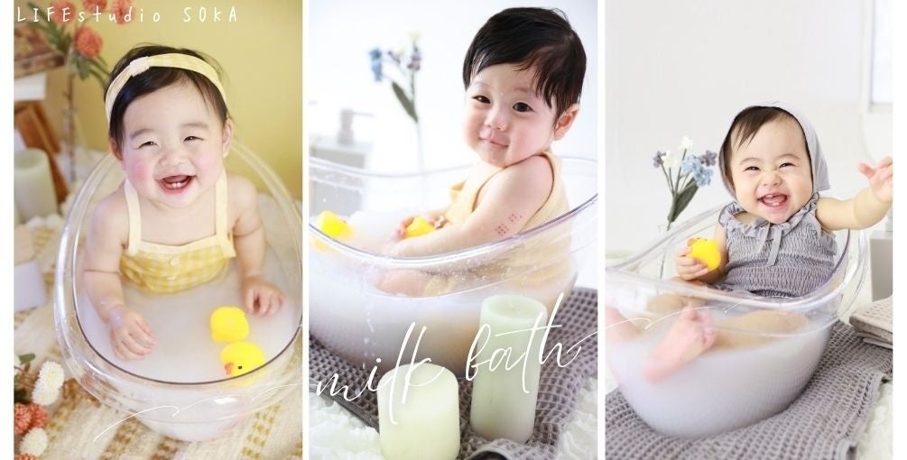 ライフスタジオ草加店は、「ミルクバス撮影」が平日ご予約可能なすべての日程にて撮影できるようになりました。ぬくもり溢れる乳白色のお湯を使い、赤ちゃんが自然体で遊ぶ愛らしい姿を撮影できる特別プランです。