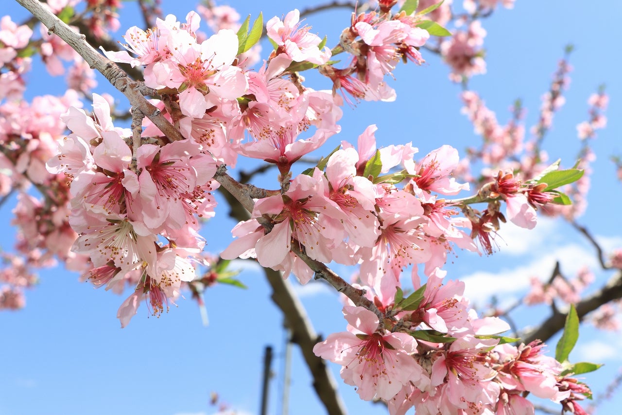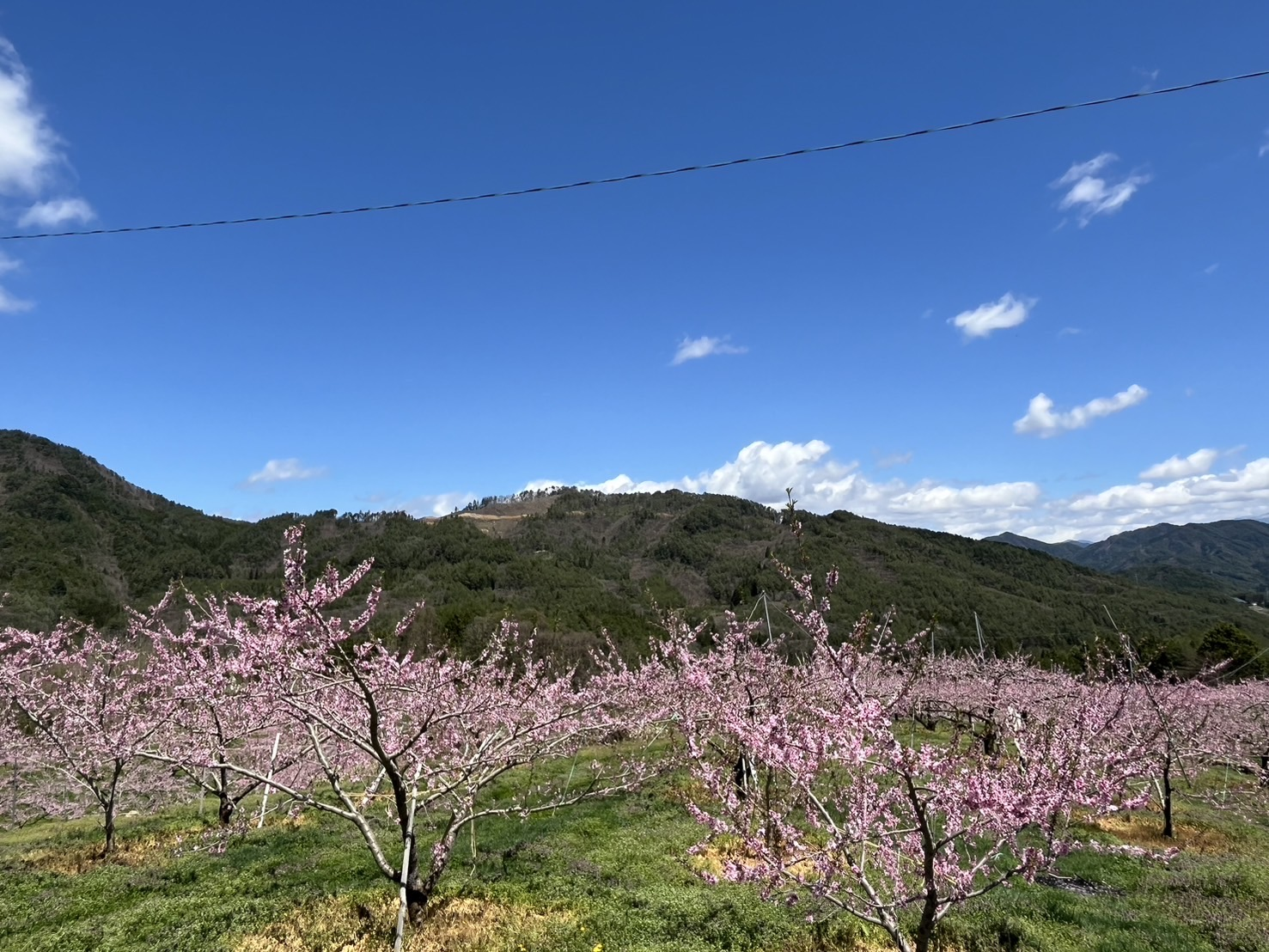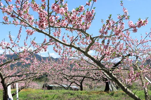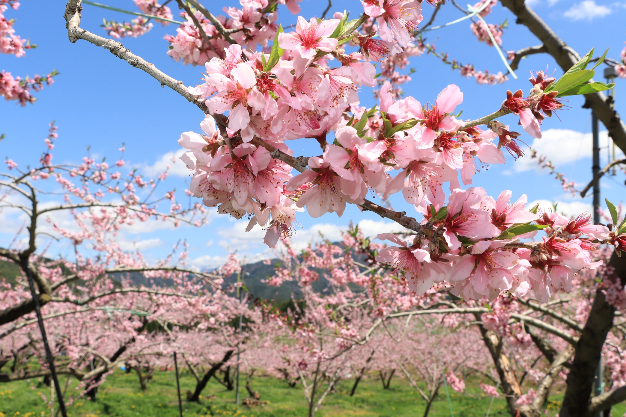 「飛騨桃」の産地である高山市久々野町の果樹園では、鮮やかなピンクの桃の花が見頃を迎え、山あいの所々を明るく染めています。4月中旬より気温が上がって、花の開花が一気に進んだようです。