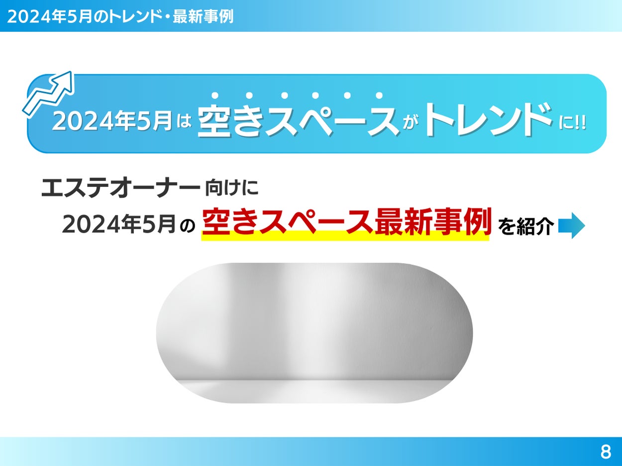 本レポートは、空きスペースを活用した事業に関する、2024年5月時点の最新トレンド及び、エステオーナー向けの新規事業に関する情報について紹介しています。