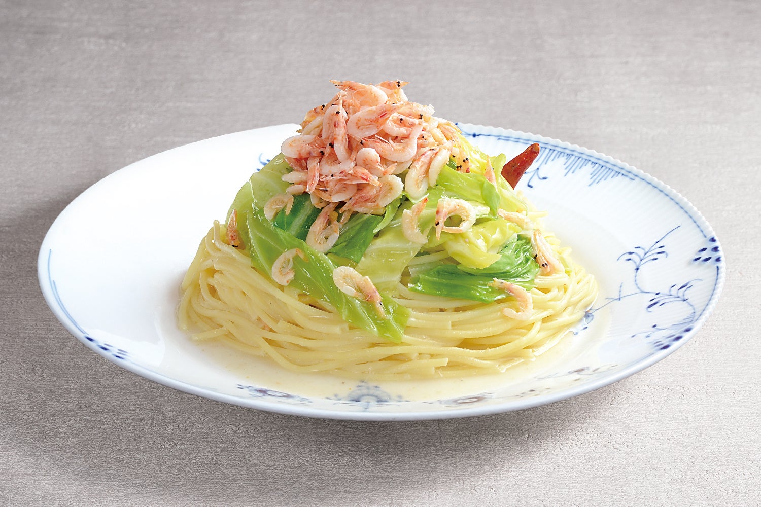 この時期ならではの柔らかく甘い春キャベツに釜揚げ桜えびを合わせた春の定番パスタ。