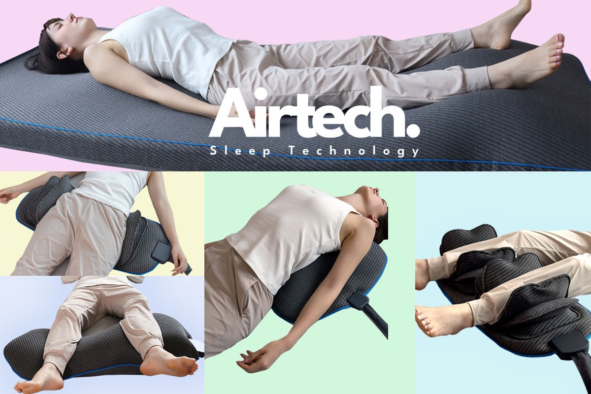”動く寝具”エアテックシリーズは、「寝つきが悪い、眠りが浅い」などのお悩みに寄り添った、入眠環境を整える動的寝具です。内臓されたエアバックの膨張と収縮が作り出す動きにより、寝たままの状態で軽いストレッチを行い入眠を促します。入眠をスムーズにすることで深い眠りへと導き、睡眠の質向上をサポートするアイテムとして人気のシリーズです。