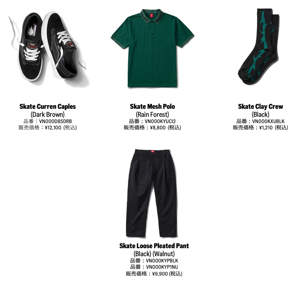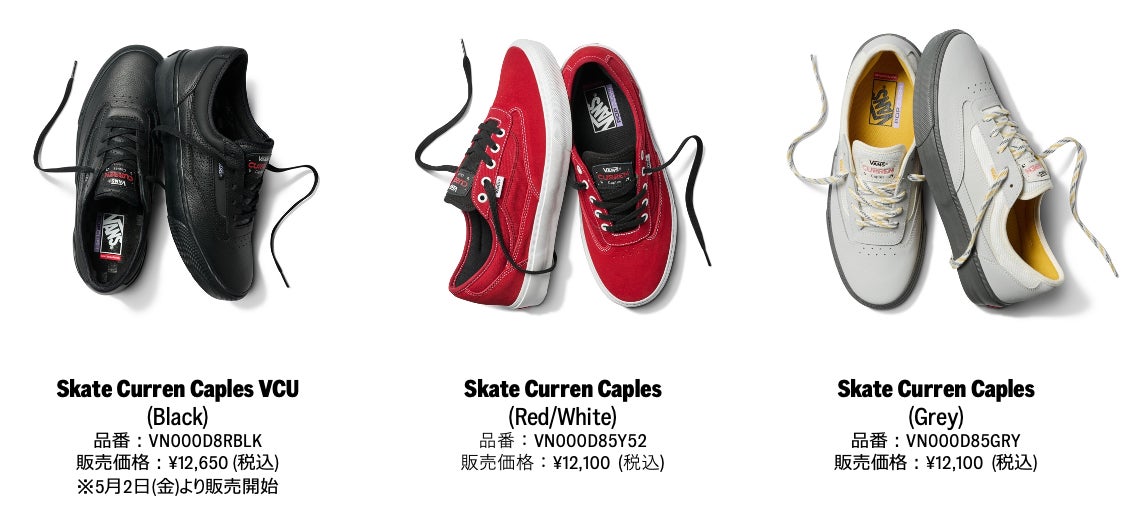 「Skate Curren Caples」はシューズ4色、アパレル4種をラインアップし、 Vans公式オンラインストアをはじめ、Vans Store各店、その他Vans正規取扱スケートショップで展開いたします。