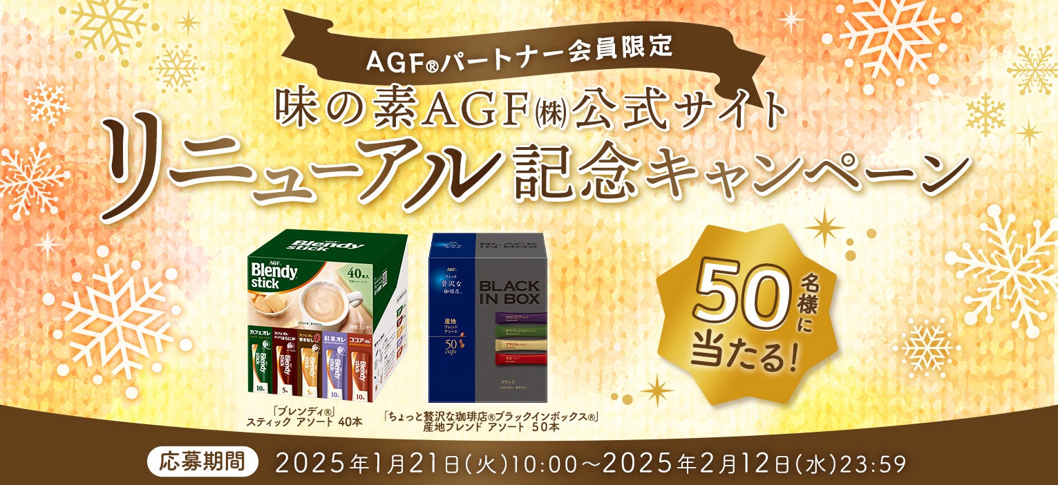 また、サイトのリニューアルを記念して、味の素AGFが提供する会員サービス「AGF®パートナー会員」限定のプレゼントキャンペーンを2025年1月21日(火)から2025年2月12日(水)まで実施します。