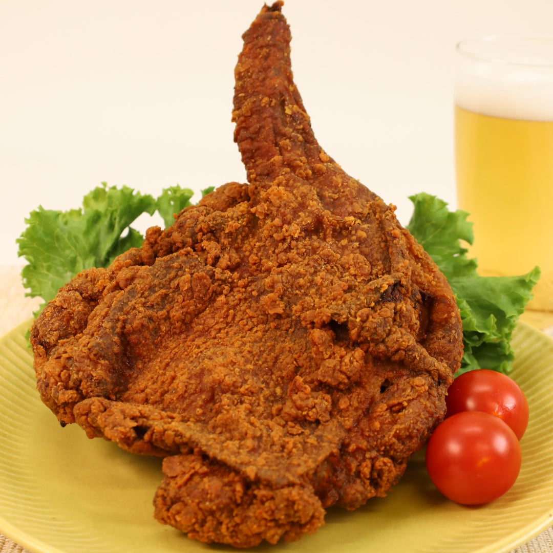 大阪・関西万博フードフェスでも注目を集めた迫力満点のフライドチキンを、ハロウィンに合わせて数量限定で販売します。ほぼ顔サイズのビッグサイズで、外はカリッと香ばしく、お肉はジューシーに仕上げました。岩手県産の鶏もも肉を使用し、スパイシーとプレーンの2種類をご用意。骨の一部を取り除いているので、かぶりついても食べやすくなっています。食卓に出せば“おばけ級”の存在感でホームパーティーの主役になること間違いなしのフライドチキンです。