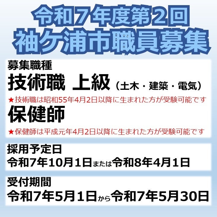 <令和7年度第2回 袖ケ浦市職員採⽤試験(技術職(土木・建築・電気)/保健師)の4職種で実施>⺠間企業との併願希望者や転職活動をされている⽅等、幅広い層のご応募をお待ちしています!