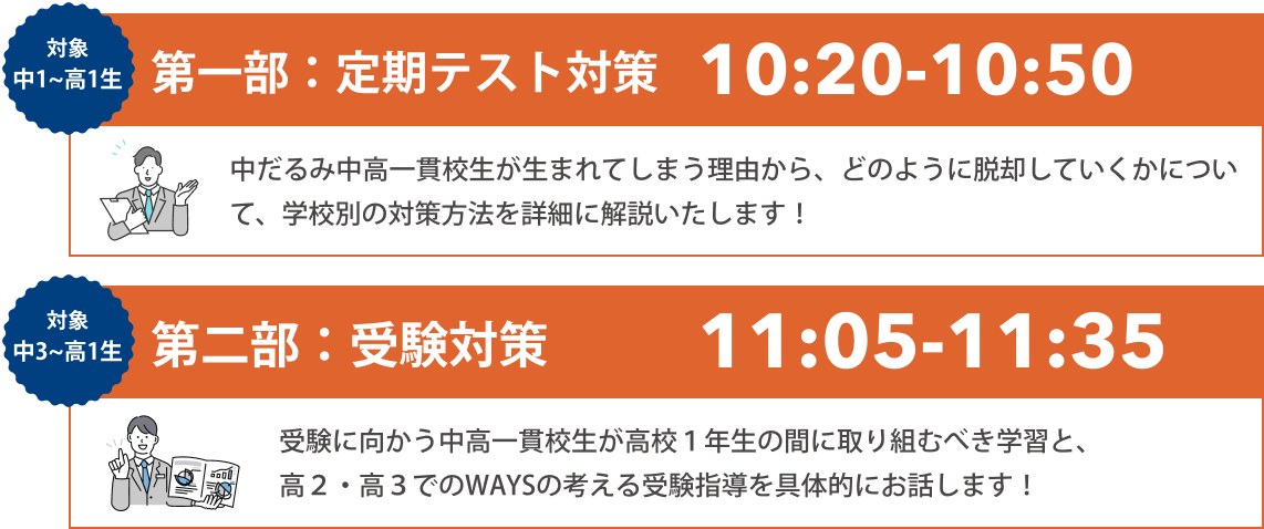 本セミナーは、多くの中高一貫校生が直面する「中だるみ」の脱却法(第一部) から、数年後を見据えた「最新の大学受験対策」(第二部) まで、中高一貫校生の6年間をトータルサポートする専門塾WAYSならではの知見を二部構成でお伝えするものです。