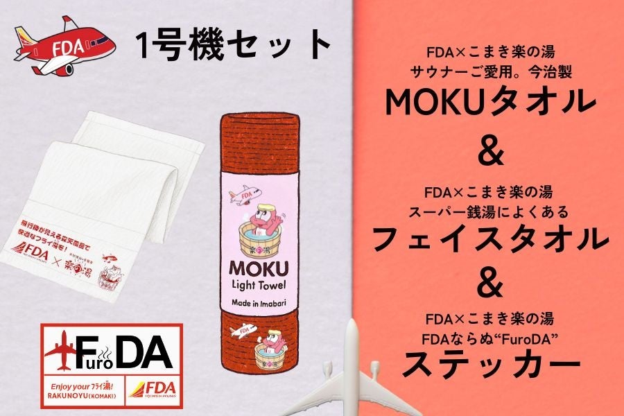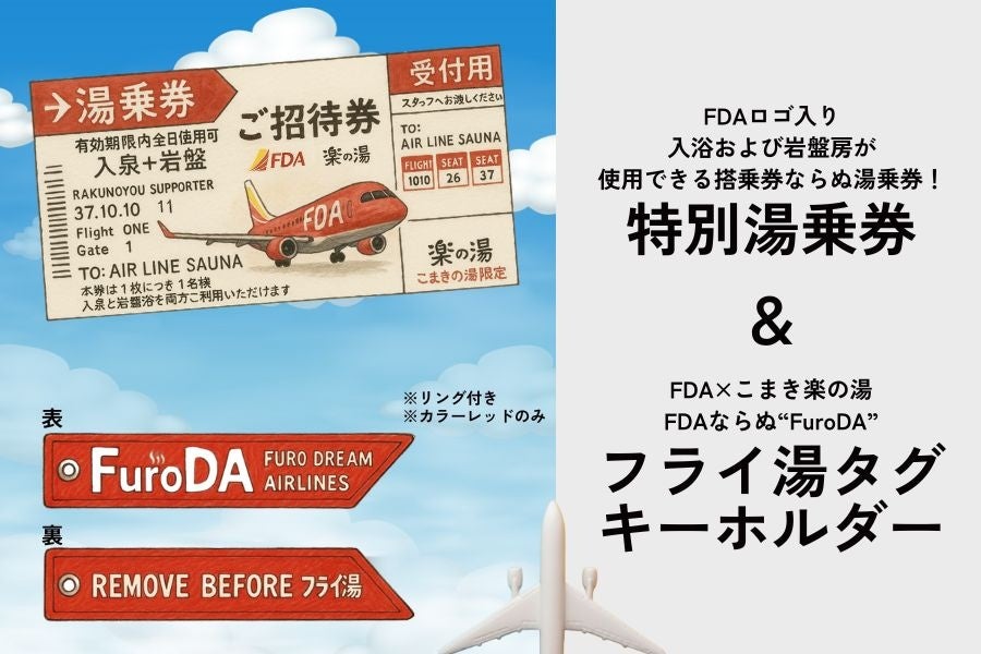 支援者の皆さまには、「搭乗券風の入浴チケット」や「FDA×楽の湯 コラボグッズ」など、空の旅気分が楽しめるオリジナルリターンをご用意しています。