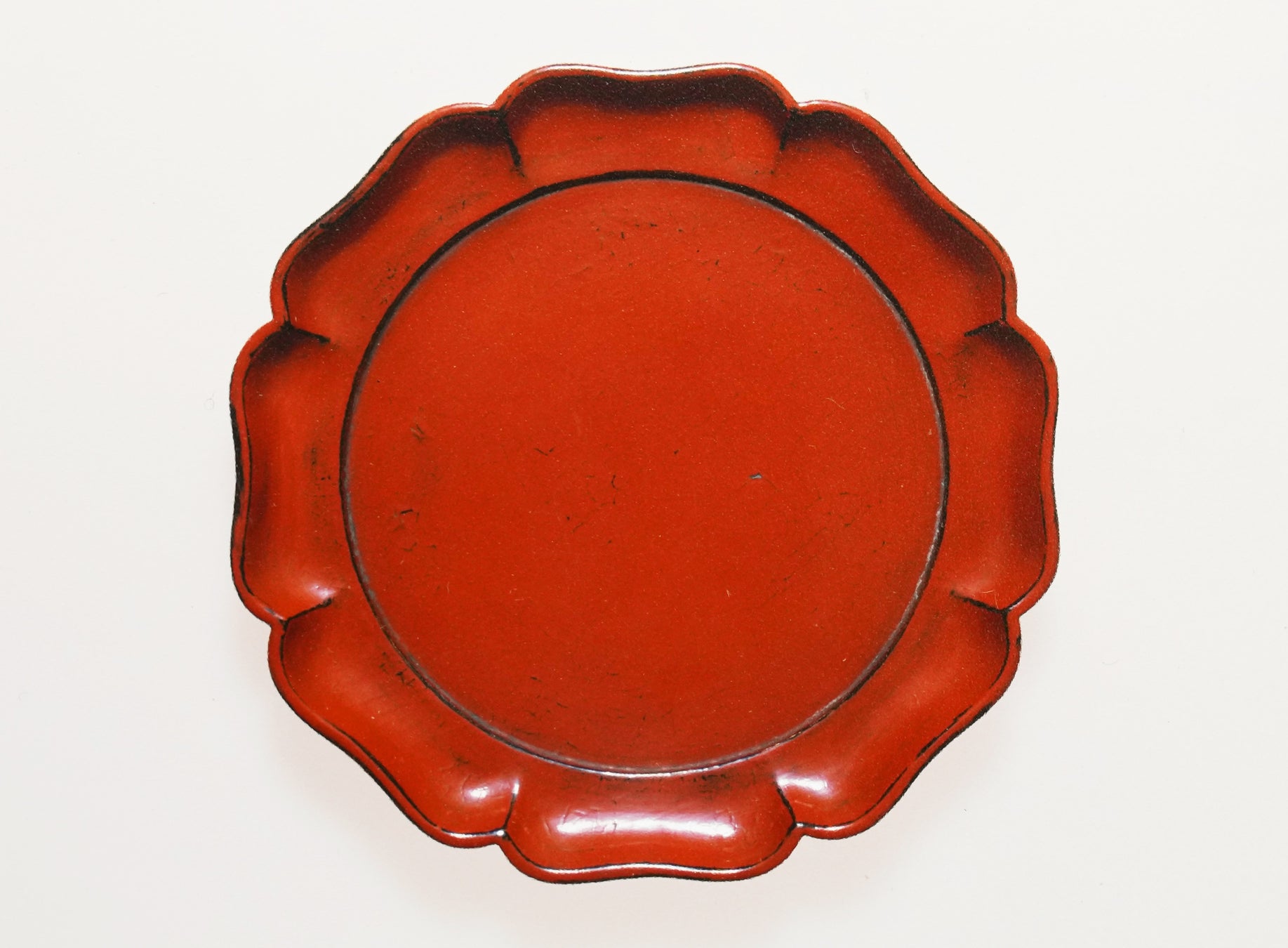 縁を花びらのすがたに象った盆で、中国伝来の器物の形を写しとる。特に大型の輪花盆は中世の絵画資料にみる喫茶や宴席の場面などに描かれてきており、日常的に使用された。本作は長年の使用や手擦れにより、朱漆がところどころ摩耗していき、下に塗った黒漆が表面に見える。用途に即した形の美しさや優れた耐久性に加えて、ありのままの無作為なさまは、近現代の茶人をはじめ美術コレクターたちをも魅了し、鑑賞の対象となっている。