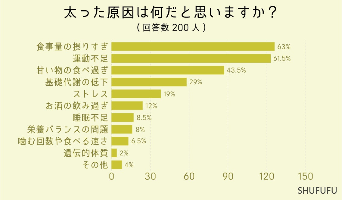 ダイエットの”きっかけ”を200人に調査「52%」の人が選んだ理由は?太った原因の多くは「食べ過ぎ」「運動不足」