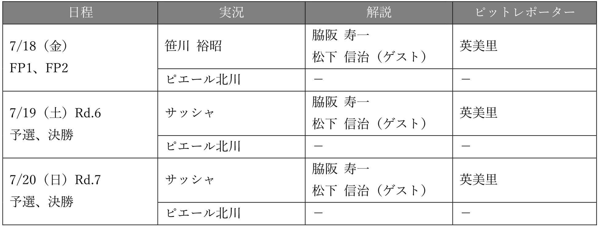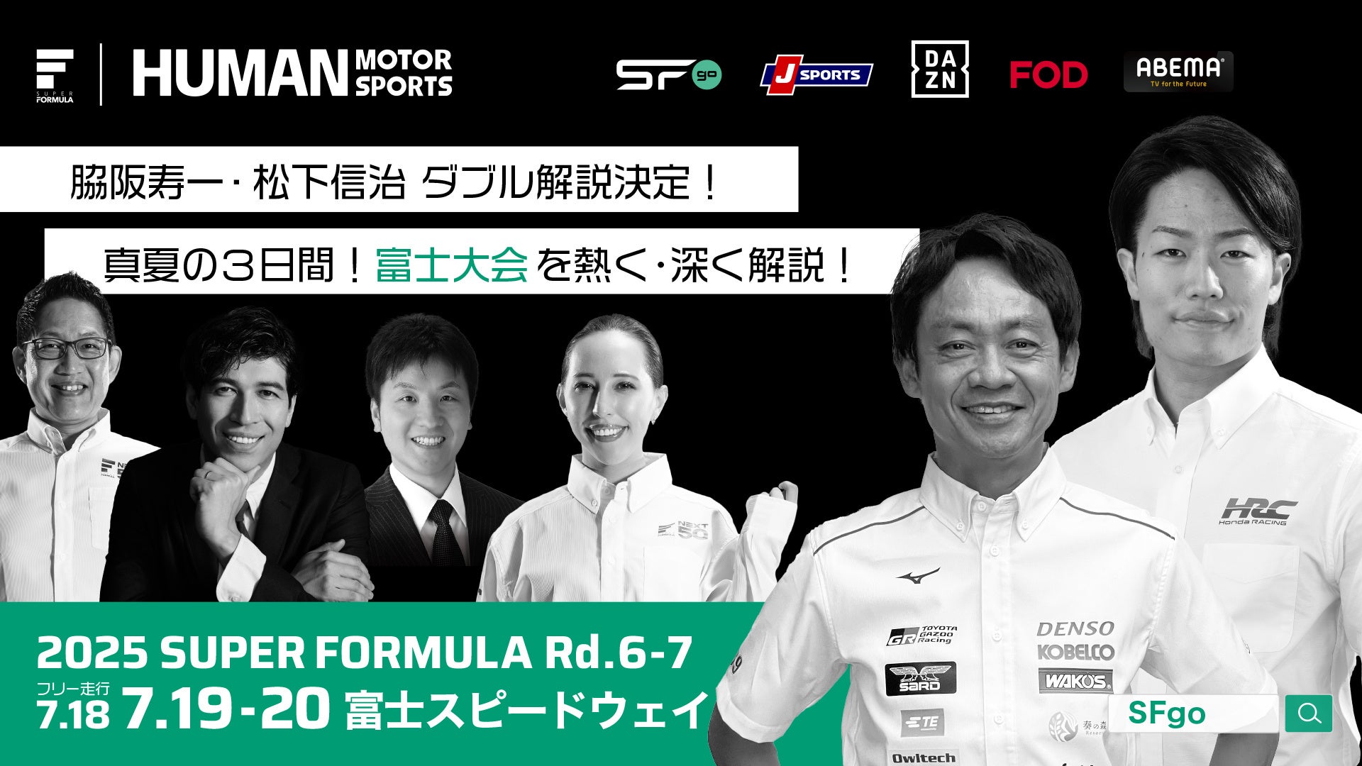 7/18(⾦)19(⼟)20(⽇) SUPER FORMULA第6・7戦富⼠⼤会 脇阪寿⼀さん、松下信治さんによるダブル解説決定! 〜2025シーズンの⾏⽅を占う真夏の富⼠3⽇間!熱く・深く解説!〜