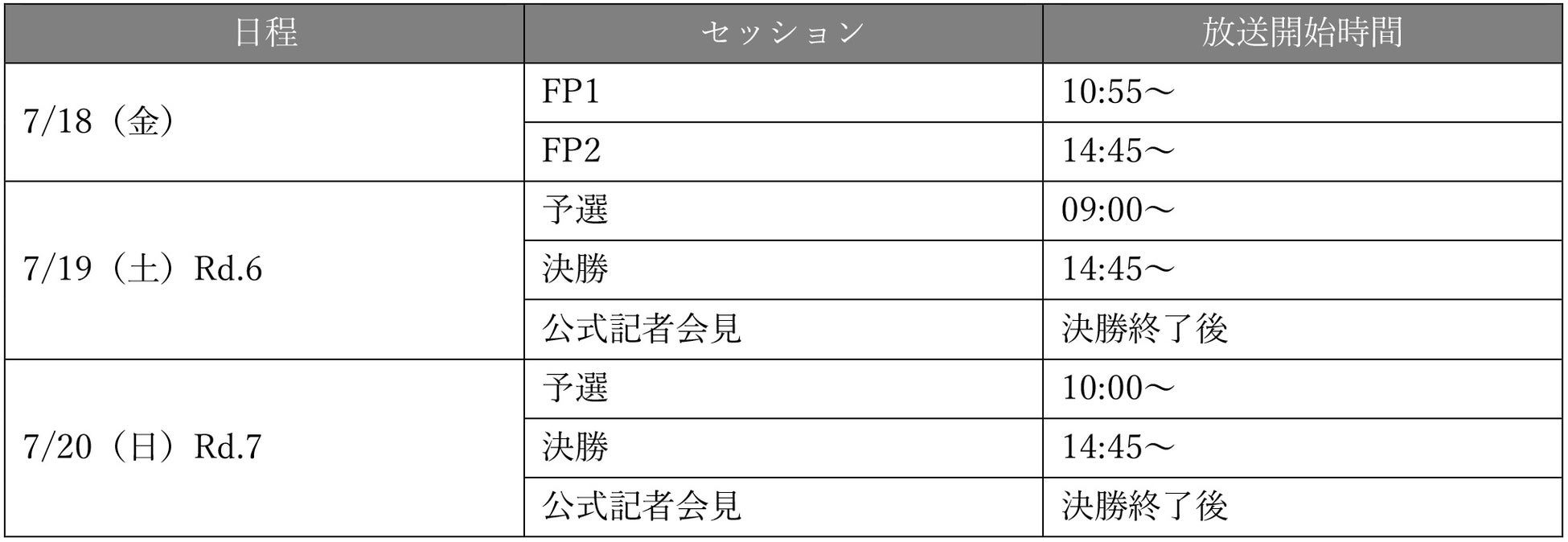 国内最⾼峰で最速のフォーミュラカーレースシリーズである全⽇本スーパーフォーミュラ選⼿権(以下「SUPER FORMULA」)を開催する株式会社⽇本レースプロモーション(以下「JRP」)は、7⽉18⽇(⾦)・19⽇(⼟)・20⽇(⽇)の3⽇間、富⼠スピードウェイ(静岡県⼩⼭町)で開催されるSUPER FORMULA第6戦・第7戦富⼠⼤会の放送情報を発表いたしました。