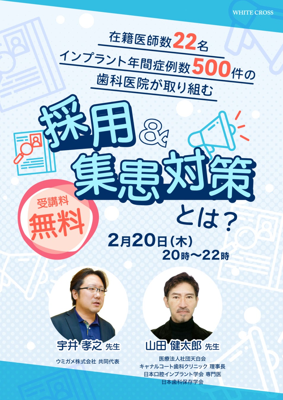 歯科医師向けに、WHITE CROSS様より2025年2月20日(木)20:00〜22:00に配信、ライブ配信終了後は、2025年3月21日(金)23:59まで録画視聴期間を予定しています。