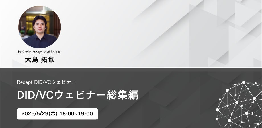 本ウェビナーでは、DID/VCの社会実装に取り組む株式会社ReceptでCOOを務める大島が登壇し、DID/VCを専門とするベンチャー企業「Recept」が毎月開催しているウェビナーの総集編となります。