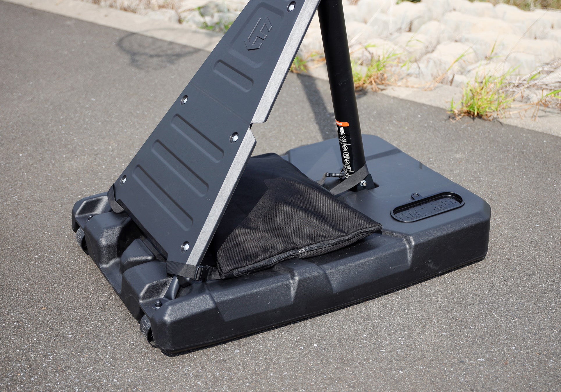 大型バックボードと支柱を支えるために、オリジナル大容量のベースタンクを開発。広い注水口を採用することで、従来品よりも水・砂を充填しやすくなりました。更に安心してご使用いただくために、20kgの砂袋を入れることができるウェイトバックを付属。