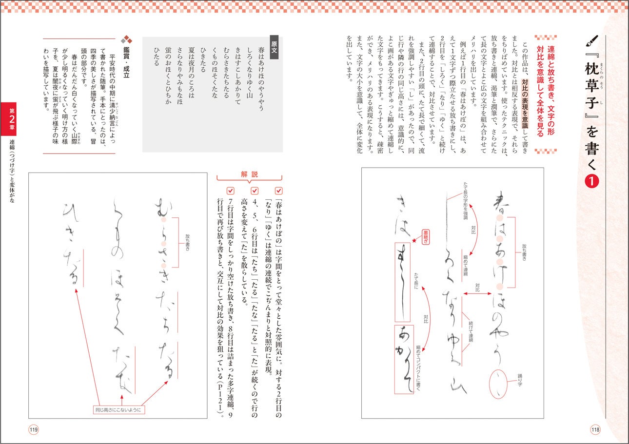 和歌や「枕草子」、「源氏物語」などの古典、「赤とんぼ」や「虫の声」などの童謡を手本として紹介しています。なじみのある言葉なので、書きやすいのではないでしょうか。