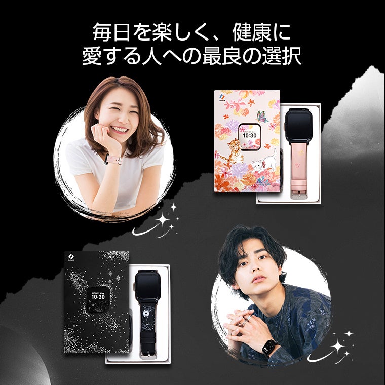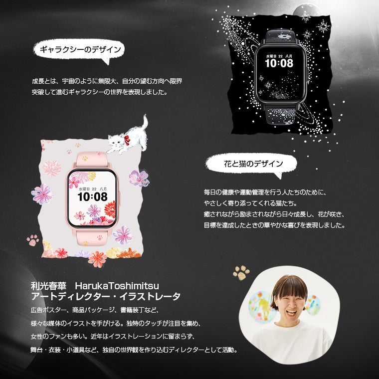 本限定モデルでは、「自分らしく生きる」をテーマに、2種類のオリジナル表盤・表帯デザインを制作。健康管理を楽しむすべての人に寄り添うアート性の高いデザインが特長です。