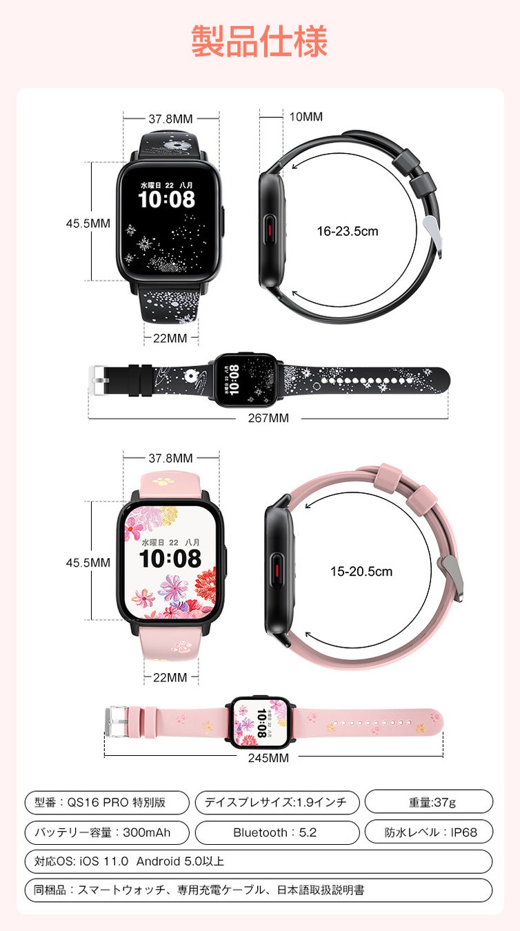 Bluetooth通話 着信通知 SOS機能 スマホ探し 音楽再生 カメラ制御 天気予報アラーム、 座りすぎ通知 |
