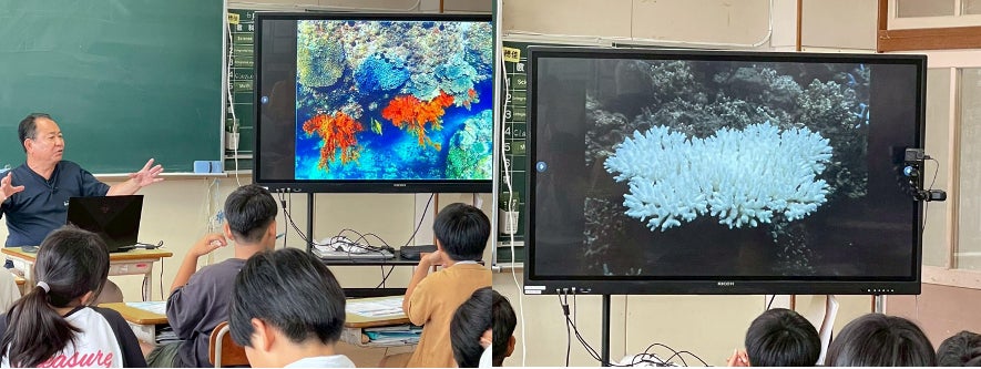 足摺海洋館SATOUMIの新野館長は、豊かな生態系を誇る竜串湾の魅力について語りました。竜串湾では110種のサンゴや384種のウミウシが確認されていて、日本最大級のシコロサンゴも存在します。一方で、海水温の上昇によるサンゴの「白化現象」や、本来いなかったオニヒトデによる食害など、海の生き物たちが直面している危機的状況についても説明しました。