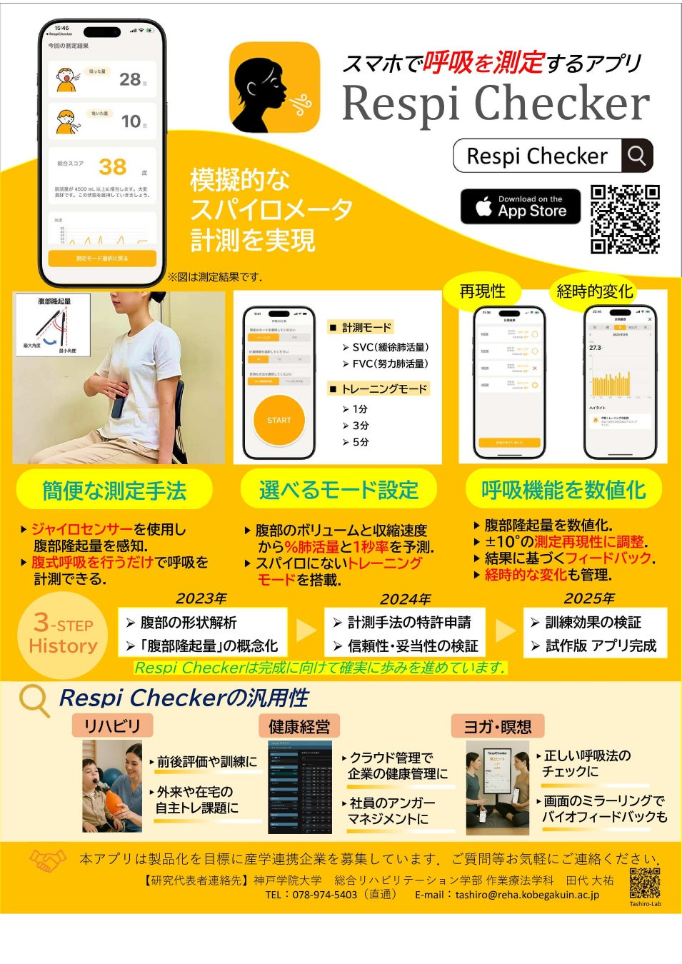 神戸学院大学総合リハビリテーション学部作業療法学科の田代大祐講師は、スマートフォンを用いて呼吸機能を簡便に測定・可視化できるアプリ「Respi Checker(レスピチェッカー)」を開発し、AppStoreにて配信しました。