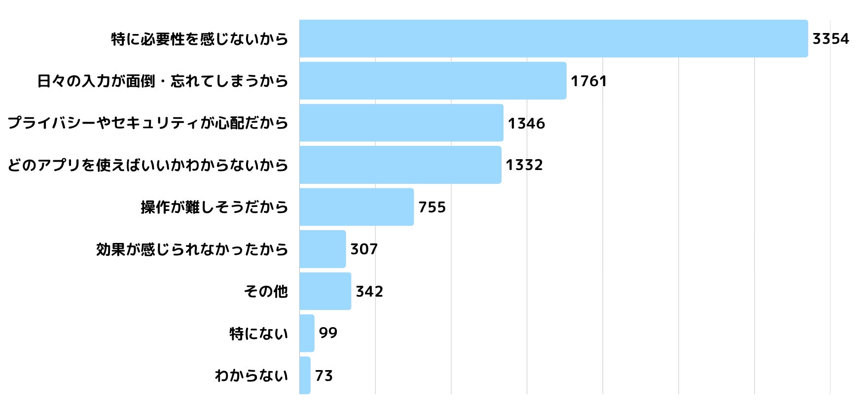 予防意識が高い層ですら5割弱が健康管理アプリの利用を「中断」しています。では、なぜ健康管理アプリの利用を「継続」できないのか、あるいはそもそも「開始」できないのでしょうか。