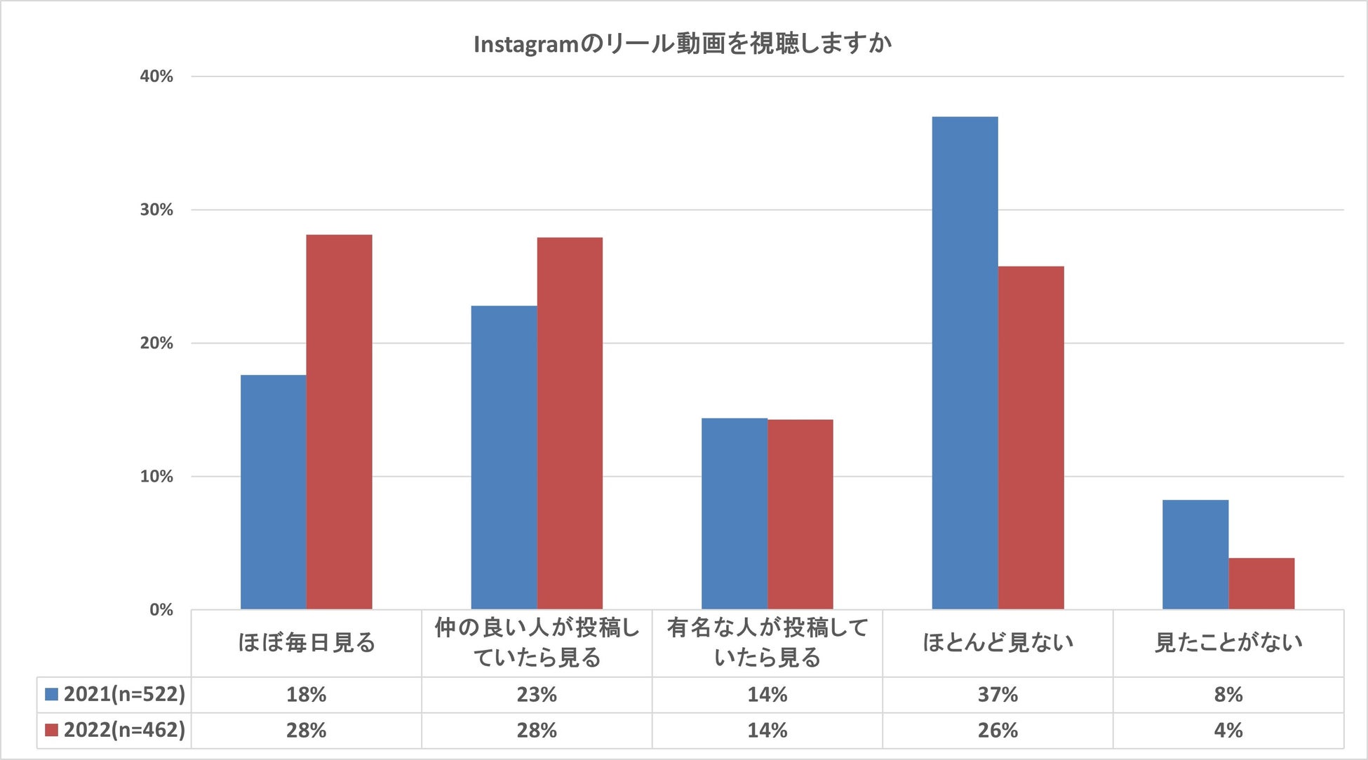 Instagramリール「ほぼ毎日視聴」約3割、21年比で10ポイント伸長<フーディーテーブル>