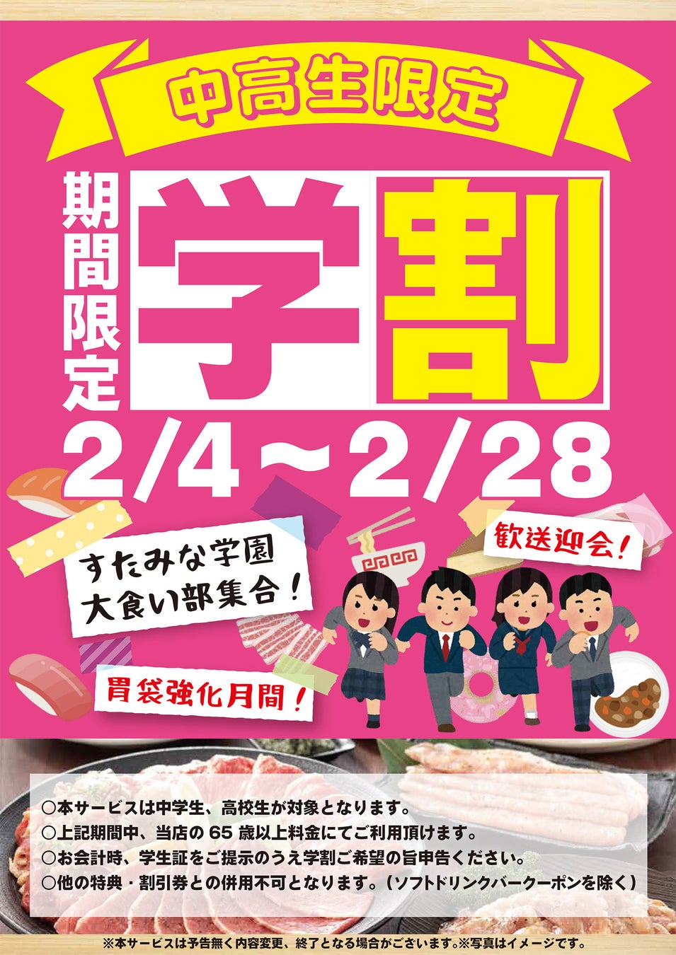 対象店舗:すたみな太郎全店、すたみな太郎PREMIUM BUFFET全店 ※すたみな太郎NEXT、喰喰池袋店は通常の料金に中高生料金がございます。