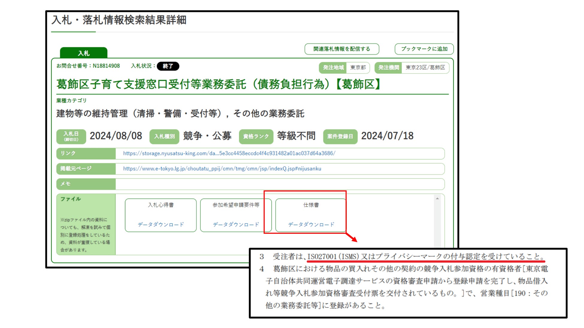 仕様書の中に書かれている「ISO27001」や「ISMS」、「プライバシーマーク」で検索結果にヒットさせたい