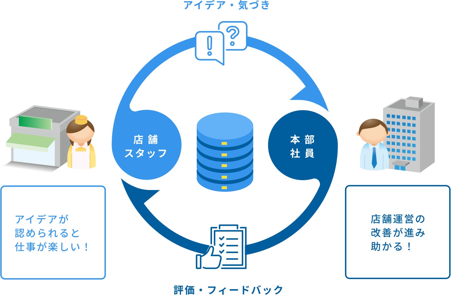 本サービスはスタッフが日々現場で働く中で感じるムリ・ムラ・ムダへの気づきや、解決策のひらめきにスポットライトを当てました。本部がスタッフのアイデアを認め、フィードバックし、採用することで、スタッフのやりがいを引き出し、同時に全店における業務改善を実現します。