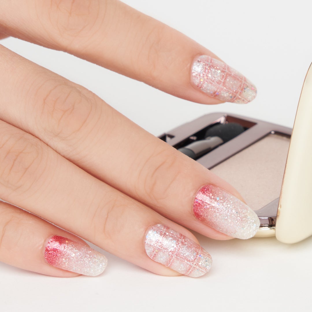 ホワイトベースに赤いチェック&グラデーションを描いたグリッターネイル。赤と白のコントラストが目を引き、ポジティブでポップなムードを楽しみたい時にピッタリです。遊び心のあるコーディネートのワンポイントにもGood。