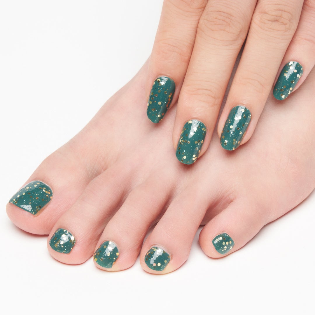深い森のようなグリーンに大小の異なるゴールドのラメを散りばめたグリッターネイル。クリスマスツリーとオーナメントの輝きを思わせる組み合わせは、モノトーンやアースカラーとの相性も抜群。さまざまなシーンで活躍しそう。