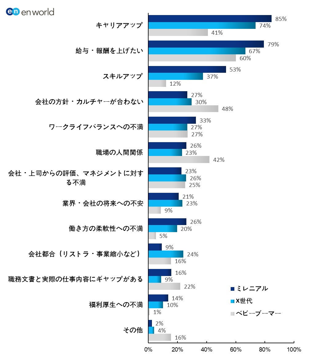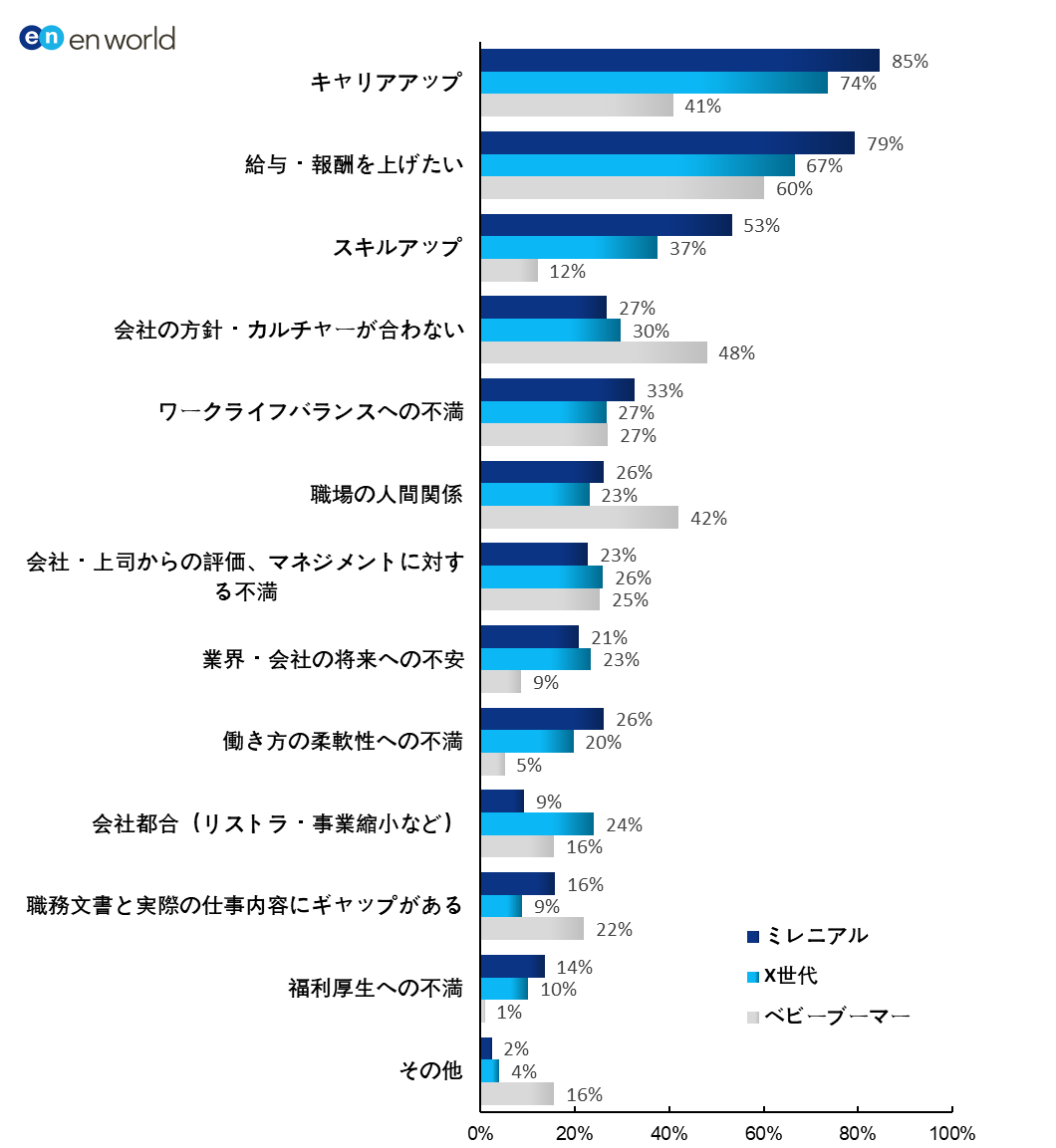 1.転職を考える理由、ミレニアル・X世代で「キャリアアップ」が1位