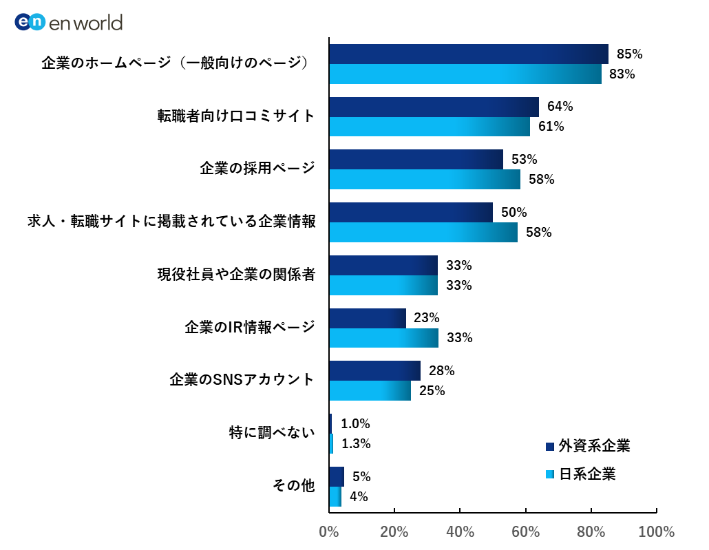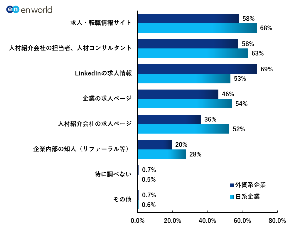 「求人の情報収集先」に関しては、全体で「求人・転職サイト」(64%)が 1 位でしたが、外資系企業に所属する求職者に関しては「LinkedIn」(69%) が1 位となり、日系企業の求職者と大きく差が開く結果となりました。