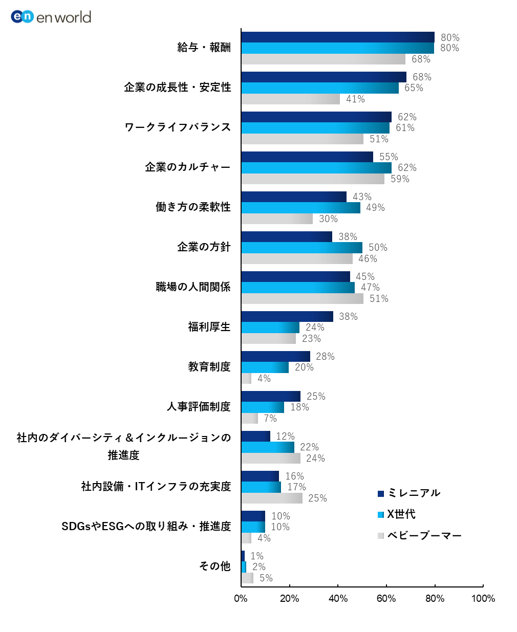 「企業を選ぶ際に重視する要素」に関する質問では、全体で「給与・報酬」(78%)が最多となりました。世代別に見ると、ミレニアル世代では「福利厚生」(38%)、「教育制度」(28%)、「人事評価制度」 (25%)など、組織体制・制度に関する項目で他世代よりポイントが高い結果となりました。一方、ベビーブーマー世代では、「企業のカルチャー」(59%)、「職場の人間関係」 (51%)が上位(2位、3位)にランクインするなど、前設問の結果と同様、企業の風土や人・コミュニティを重視する傾向が見られました。