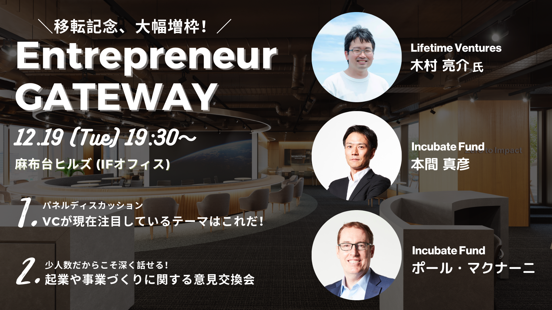 ・12月19日(火)開催「【新オフィス移転記念!大幅増枠開催】Entrepreneur GATEWAY」