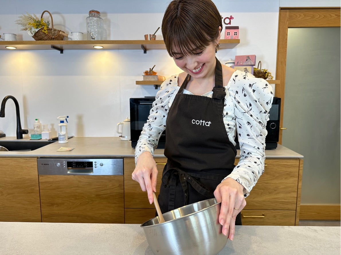 cottaはこれまでにも、有名シェフやcottaスタッフによるライブ配信を行ない、さまざまなレシピをご紹介してきました。今回は、タレントの南明奈さんに出演いただき、DAISOで販売しているcotta監修のミックス粉を使用した「濃厚生ガトーショコラ」の実演をしていただきました。「膨らみが悪い」「空洞ができる」など、少々ハードルが高い印象のガトーショコラですが、本ミックス粉を使用すれば特別な材料・道具を使用しなくても、簡単に本格的なガトーショコラが作れます。実際に、南さんからも「思っていたより調理器具が少ない」「チョコレートのお菓子は好きだけれど、計量が大変であまりお菓子作りをする機会がなかった」とコメントをいただきましたが、本ミックス粉にはあらかじめ砂糖など必要な材料が含まれているため、どんどん混ぜていくだけでガトーショコラが完成します。詳細はぜひライブ配信のアーカイブにてご覧ください。