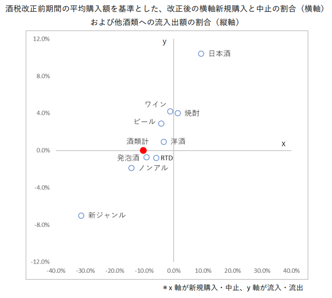 また、酒類合計で見た場合、横軸において購入中止の増加、つまり購入量の減少が確認できました。