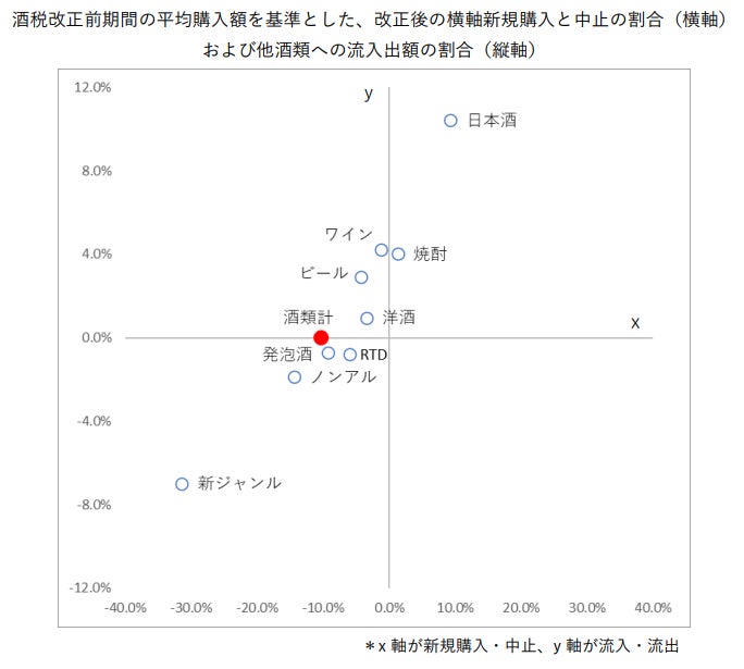 酒類カテゴリ間の移行(流入出)の割合(縦軸)に加えて、各カテゴリの新規購入と購入中止についての割合(横軸)も加味して分析すると(図2)、「新ジャンル」から他酒類への移行に合わせて購入中止の増加も明らかになりました。一方で「日本酒」は、新規購入も他の酒類からの移行もプラスだったことがわかります。これにより、当データでカテゴリ別に見た場合、今回の酒税改正前後の期間では「新ジャンル」にとってマイナス、「日本酒」にとってプラスの影響※がそれぞれあったことが確認できました。