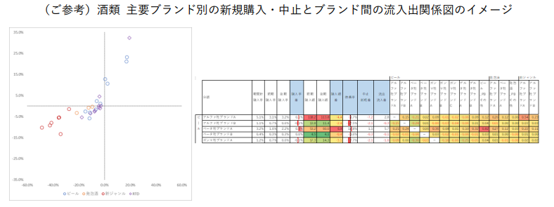 今回の分析では、ビール類にRTD(Ready To Drink)も加え、主要ブランドごとに酒税改正後の新規購入・中止、ブランド間の流入出の度合いも確認しております。詳細についてはご要望の企業様に個別にご説明させていただきますので、お気軽にお問い合わせください。