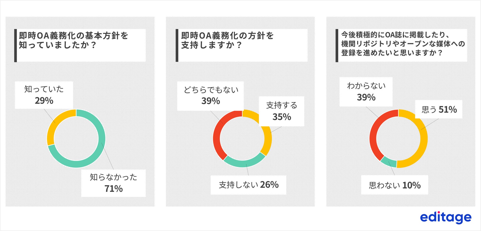 調査の結果、即時OA義務化の方針を研究者の71%が知らないことが明らかになりました。研究者はOA化に関心が強く、研究を社会に還元する理念には賛同する声が多い一方で、方針を支持する人は35%、積極的にOA化を推進したいと考えている人も51%に留まりました。研究予算が限られる中、高騰する論文投稿費用への不安が現れた結果と言えます。