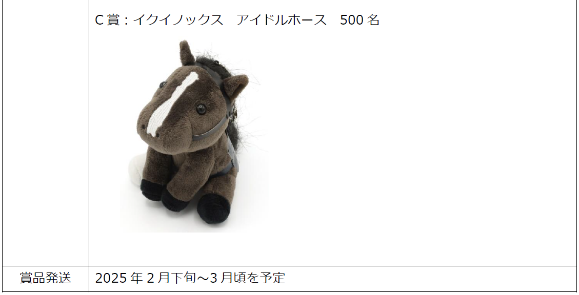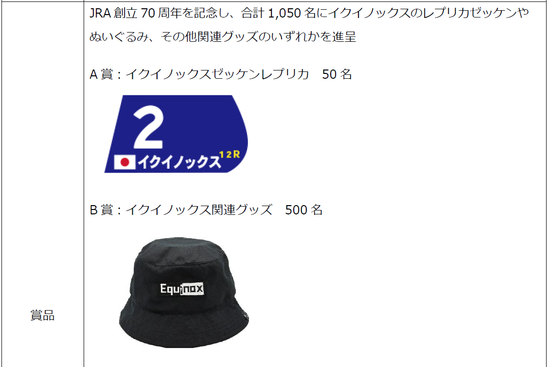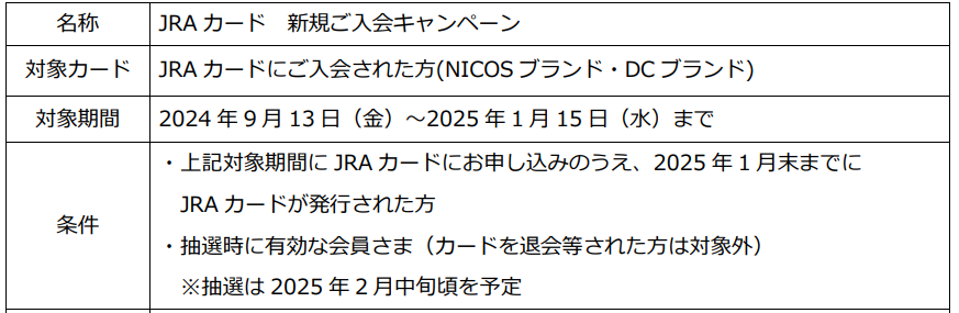 当社では新カードデビューを記念し、2024年9月13日から2025年1月15日まで、入会キャンペーンを実施します。具体的には、JRAカードのラインアップのいずれかにお申し込みのうえ、2025年1月末までに発行された方の中から抽選で合計1,050名に、イクイノックスのレプリカゼッケンやぬいぐるみ、その他関連グッズのいずれかを進呈するものです。