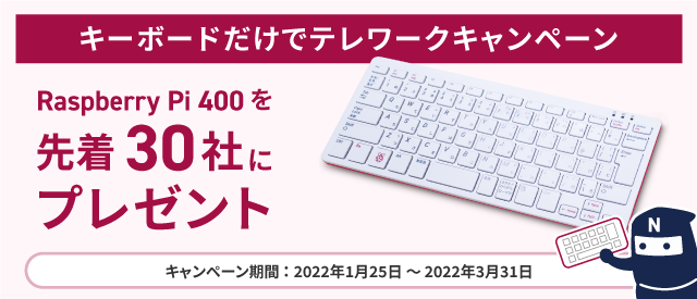 今般、NinjaConnect TeleworkがRaspberry Pi 400に対応したことを記念し、「NinjaConnect Telework」に新規ご契約いただいたお客様、先着30社限定で、「NinjaConnect Telework」接続機能搭載のキーボード(マウス、ACアダプタ、HDMIケーブル付き)を各社1台プレゼントいたします。