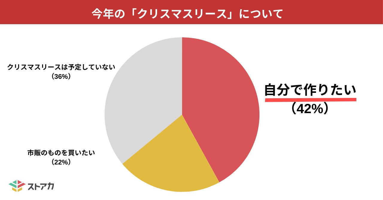 今年のクリスマスリースについてたずねたところ、回答者の42%が、市販のリースよりも「自分で作りたい」と回答しました。理由として「自分の好きなように作れるから」と回答した方が約7割にのぼりました。また「作りたいリースのデザインがあるから」など、既にデザインが確定している人も多いようです。