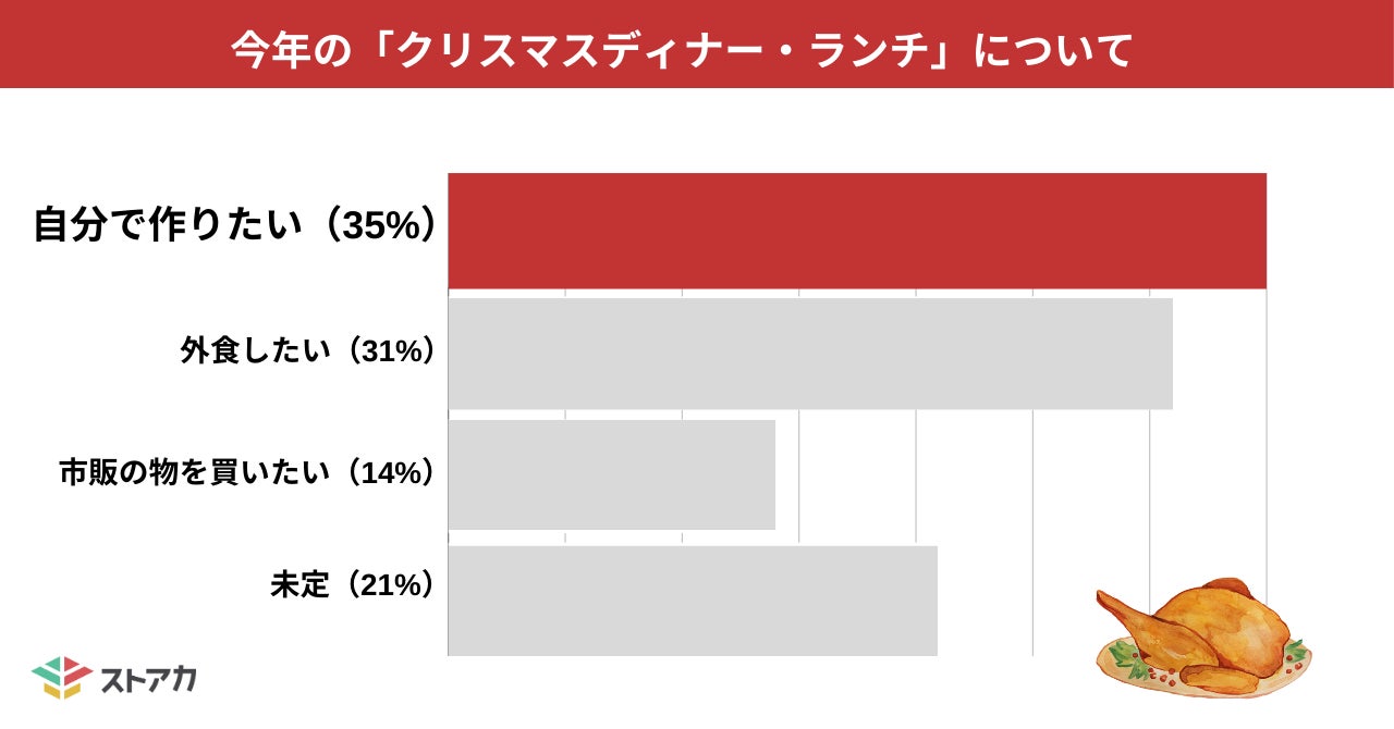 今年のクリスマスディナー・ランチについてたずねたところ、回答者の35%の方が「クリスマスディナー・ランチは自分で作りたい」と回答しました。「外食したい」(31%)と回答した方よりも上回る結果となりました。理由として「自分の好きなように作れるから」や「節約できるから」などが挙げられました。