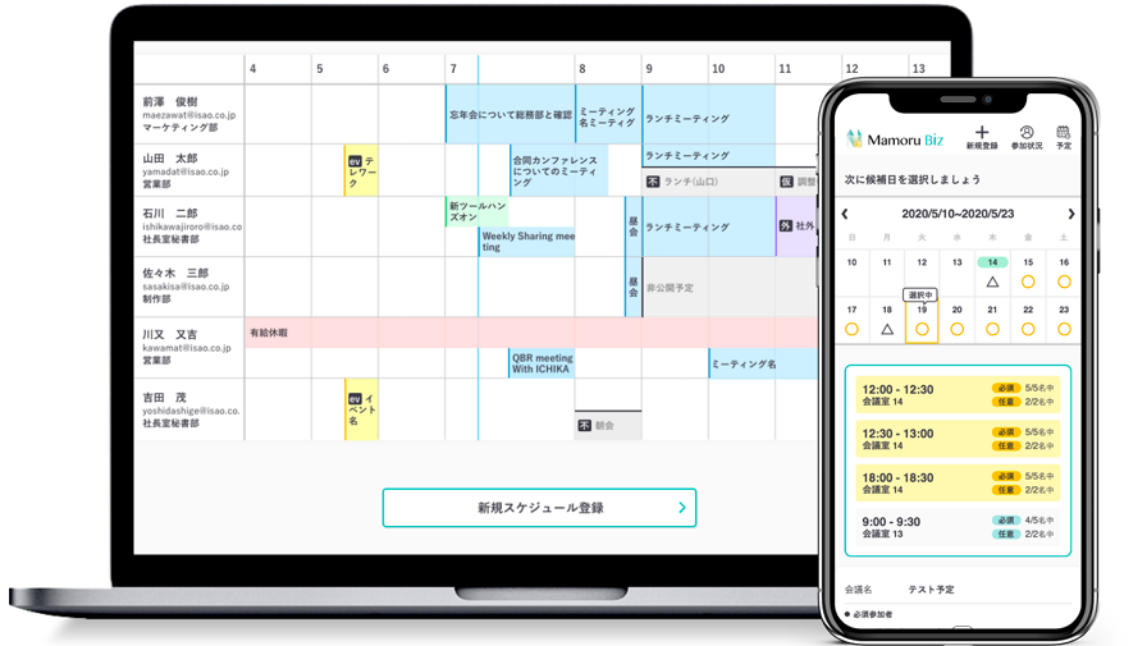 Office 365のOutlookと連携して、席と会議室の空き状況から最適な時間をレコメンドしてくれます。もう一人一人の予定や会議室の空き状況をチェックし調整する名もなき仕事からあなたを解放します。スマートフォンでも簡単に調整することができます。