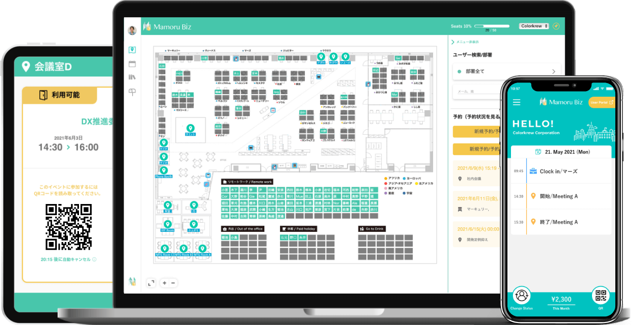 座席用のQRコードを読み取るだけで人がいる場所を可視化します。 もうフリーアドレスやリモートワーク時に誰がどこにいるか分からずに 人を探すような名もなき仕事に追われる必要はありません。 6ヶ月先の会議室予約、1ヶ月先の座席予約(ホテリング)、固定席運用も可能です。