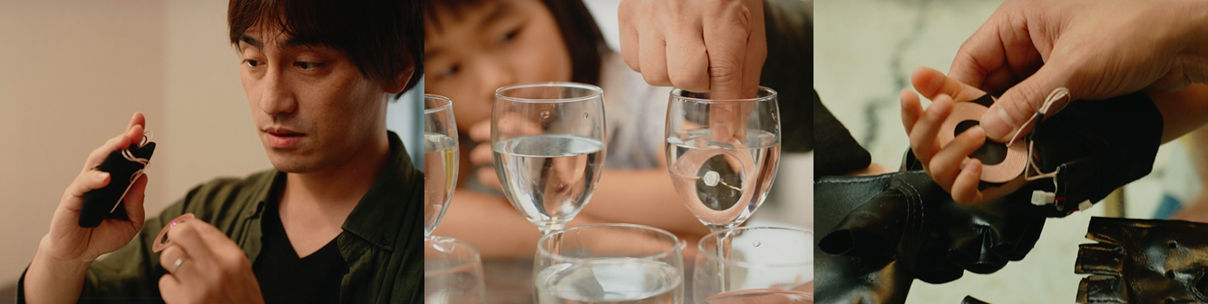 予めグラスへ受電コイルを仕込んでおき、送電コイルを内蔵した手袋を近づけると、グラスハープを鳴らすと、ワイヤレス給電で同時に点灯します。音色に合わせて、色々な色の光がイルミネーションのように光ります。